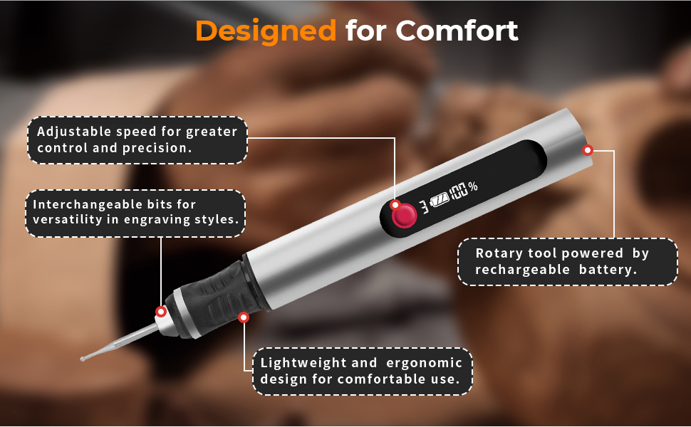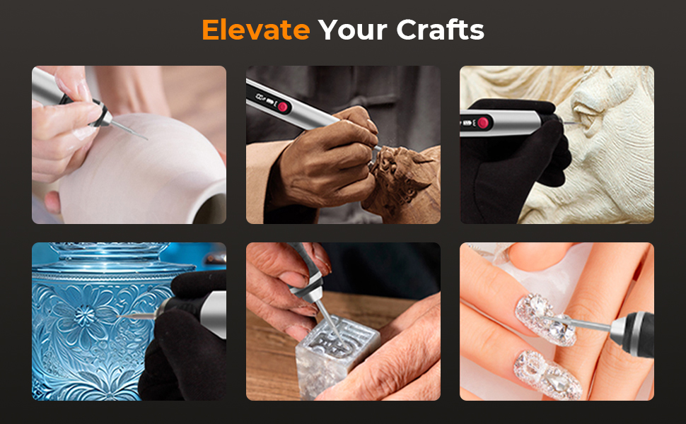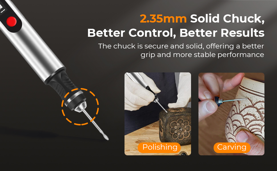 Nuestro lápiz de tallado te ayuda a abordar tu obra maestra o regalo familiar con 3 velocidades: 8,000, 16,000 y 25,000 RPM. Te permite completar diversas creaciones, desde madera más blanda hasta vidrio más duro. El motor de cobre puro significa más torque, menos tartamudeo y una vida útil notablemente larga.