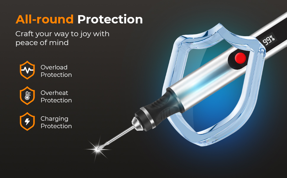 La seguridad es lo primero. El bolígrafo de grabado inalámbrico Kentfaith está construido con protección contra sobrecarga, sobrecalentamiento y carga, por lo que puedes relajarte por completo y dejar fluir tu creatividad sin preocuparte por problemas de seguridad.