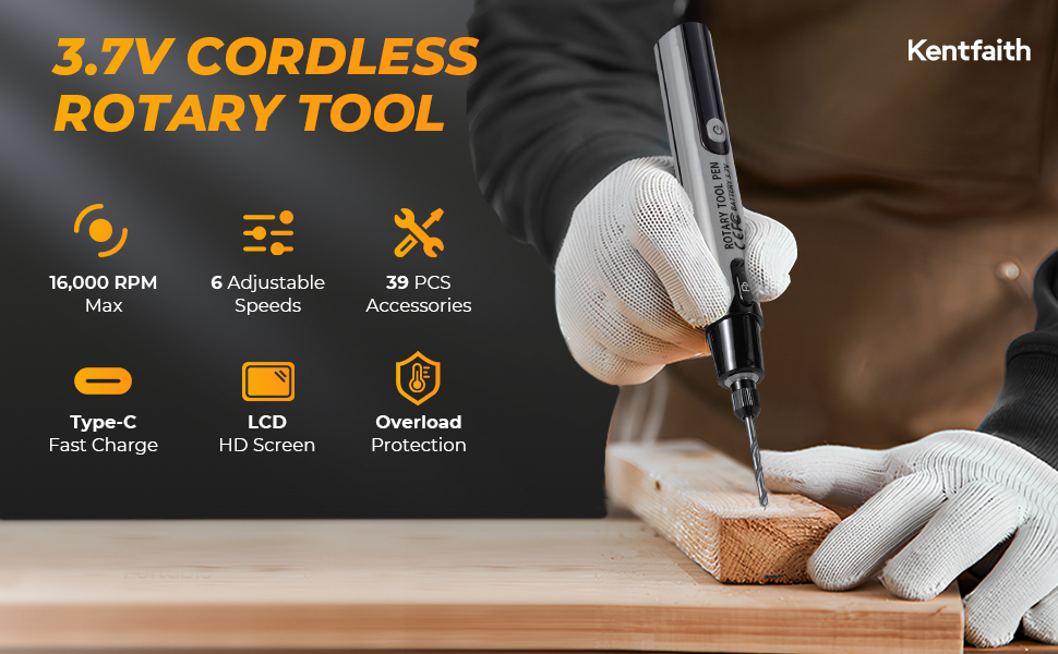 - Elige un proyecto—pulir, lijar, taladrar, tallar o grabar—¡y que comience la diversión! Enciende tu herramienta rotativa Kentfaith y siente ese suave y alegre zumbido mientras da vida a tus ideas. Cada giro y corte se siente divertido y satisfactorio. Con la mini herramienta rotativa inalámbrica Kentfaith, tendrás ese cálido y orgulloso momento de "¡Yo hice esto!".