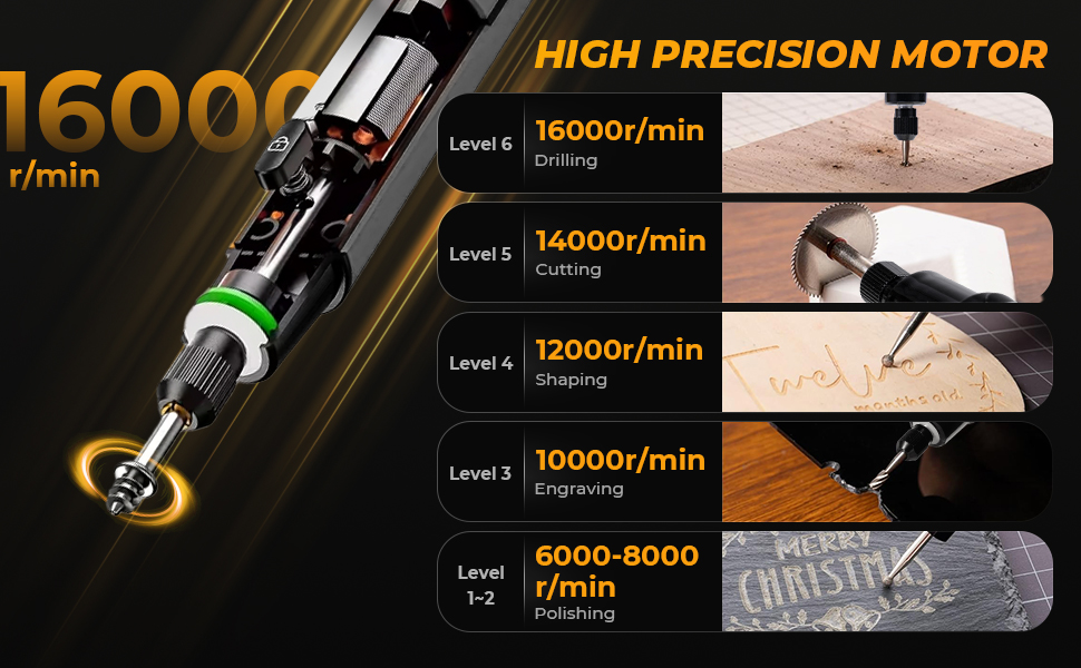 - * Más Estable, Menos Vibración y Ruido: La herramienta rotativa inalámbrica mini Kentfaith está impulsada por un motor premium de 3.7V para un rendimiento estable. Opera con vibración mínima y bajo ruido, reduciendo significativamente la fatiga de la mano para un uso prolongado y cómodo. El mandril de precisión sujeta las brocas de manera segura, eliminando el bamboleo y el deslizamiento, por lo que cada corte, tallado y detalle resulta más limpio y nítido.