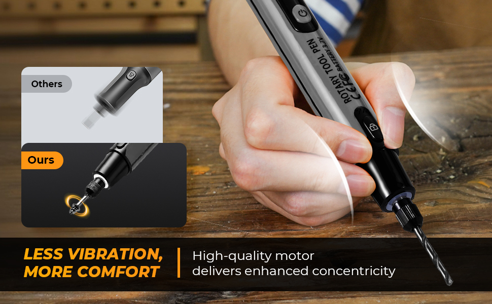 Con un motor de alta calidad y tecnología anti-vibraciones incorporada, esta mini herramienta rotativa inalámbrica funciona con una vibración notablemente menor, lo que significa un control más estable y mucha menos fatiga en la mano. Con un peso de solo 80g, está diseñada con un mango ergonómico y fácil de agarrar que se siente natural en tu mano, permitiéndote mantenerte cómodo y concentrado durante largas sesiones creativas.