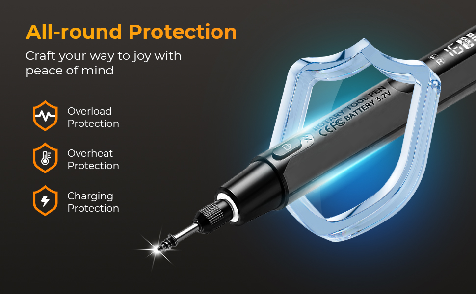 La seguridad es lo primero. La herramienta rotativa inalámbrica mini Kentfaith está construida con protección contra sobrecarga, sobrecalentamiento y carga, para que puedas relajarte por completo y dejar fluir tu creatividad sin preocuparte por problemas de seguridad.