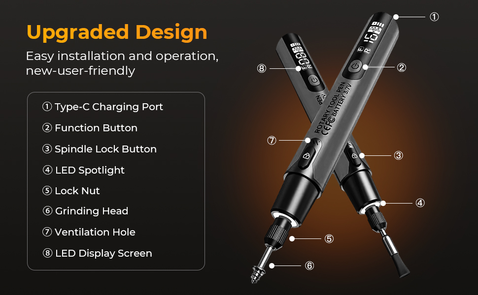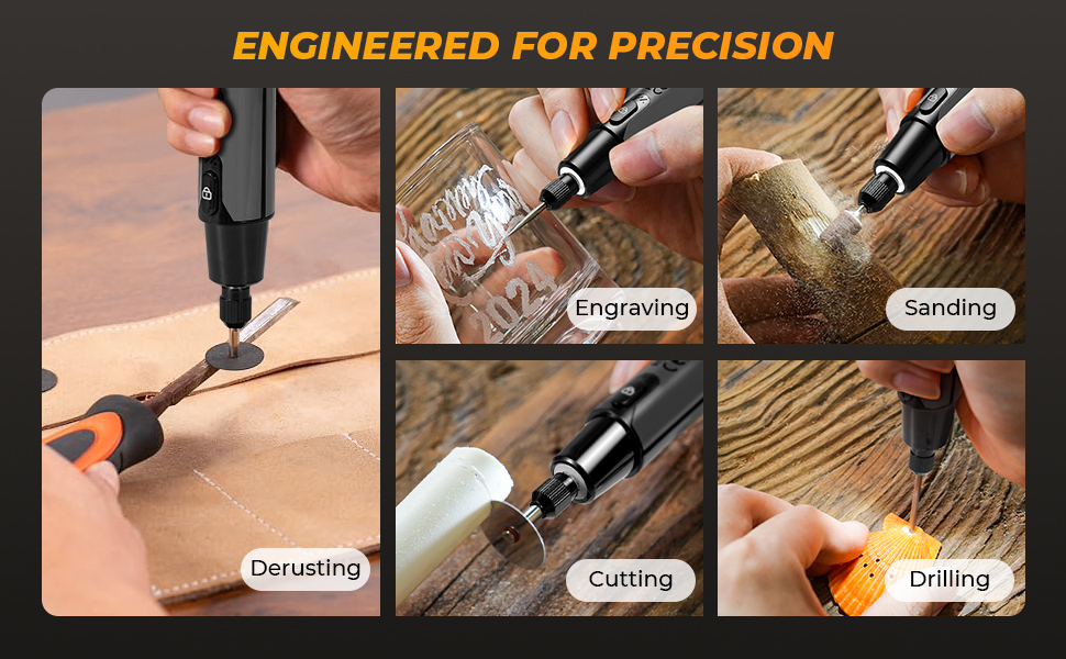 - No hay una curva de aprendizaje pronunciada. Sin complicaciones. Simplemente tómalo y comienza a crear. Esta mini herramienta rotativa inalámbrica se siente natural al instante: ligera, cómoda y fácil de controlar desde el primer uso. Y con 39 accesorios seleccionados (elegimos los más útiles y populares), estarás listo para innumerables proyectos directamente desde la caja.