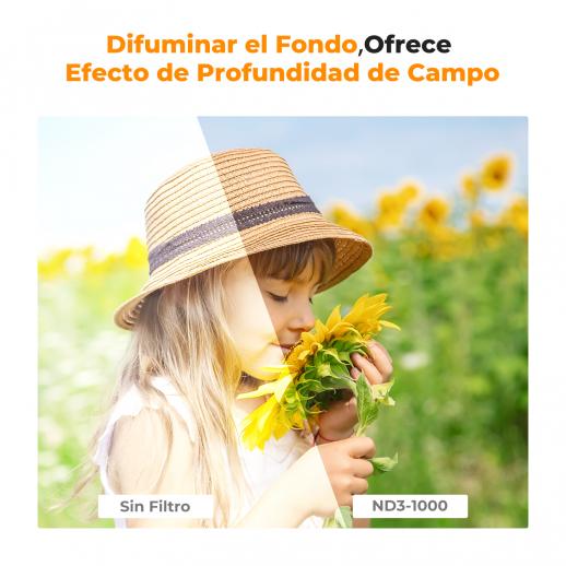 - * 【1,5–10 pasos reducción】 Filtro densidad neutra variable de 1,5 a 10 Stop. lo que le permite disparar con una apertura más amplia o con una velocidad de obturación más lenta de lo que normalmente se requiere. Para vídeo, este filtro es una muy buena elección. Un filtro ND variable es una opción más práctica y más sencilla de usar en vídeo.