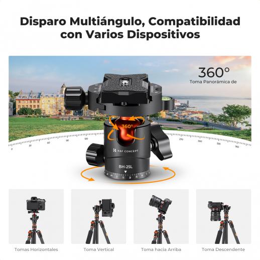 - * 【360 ° Panorámica Disparo】Rótula de bola 25mm se carga máxima 8kg, la placa de liberación rápida es compacta, ligera y rápida, es compatible con la mayoría placa Arca-Swiss, y 1/4" tornillo se puede aptar la mayoría de las cámaras, DSLR etc. Como Nikon, Canon, Sony, Olympus Panasonic Pentax, etc.
