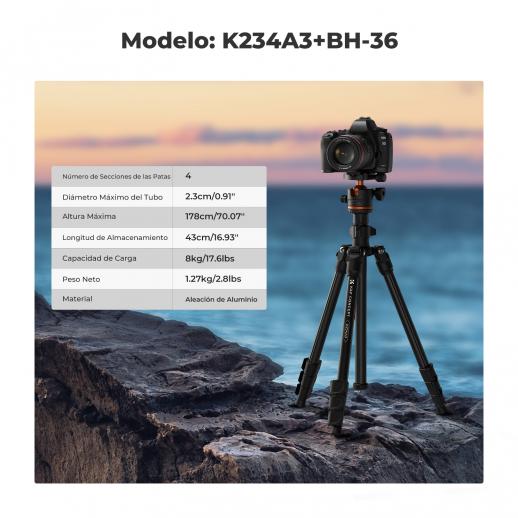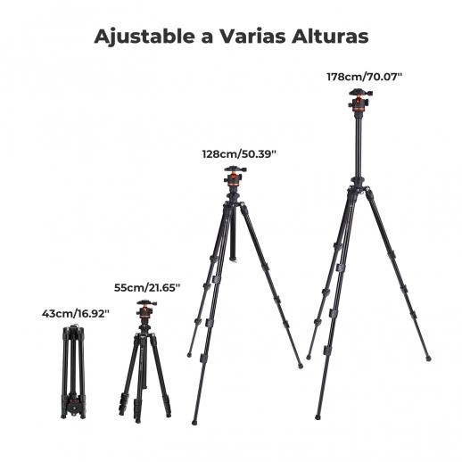 - * El peso del trípode, incluido el cabezal, es de sólo 1,28 kg, muy ligero en comparación con los trípodes estándar, lo que facilita su transporte en viajes de larga distancia o para fotografiar en la montaña.