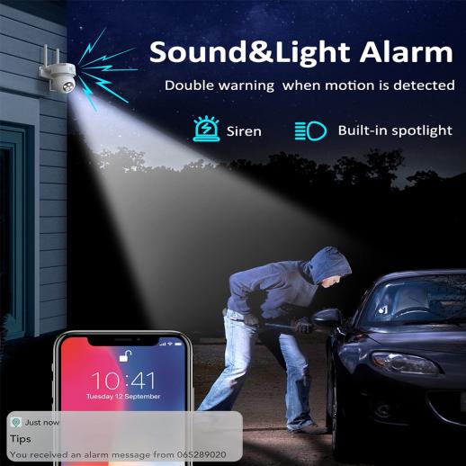 - * [355° de giro, 120° de inclinación y 3 luces LED] Con la excelente función de giro/inclinación (355° de giro y 108° de inclinación en lugar de los 90° normales), esta cámara de seguridad para exteriores PTZ vigilará un rango más amplio de la zona, podrá comprobar cualquier rincón de su casa. Además, esta cámara de vigilancia inalámbrica está equipada con 3 LEDs infrarrojos y focos, proporcionando visión nocturna infrarroja, visión nocturna en color (hasta 20m) y visión nocturna de alarma.
