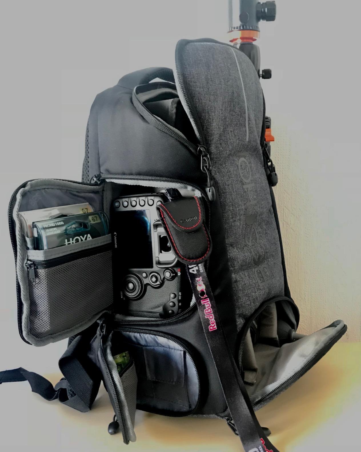 Mochila robusta, un poco pequeña, pero perfecta para llevar la cámara y tres objetivos fijos (no grandes). En mi opinión, es un bolso perfecto para explorar la ciudad o dar paseos informales. Totalmente personalizable por dentro.