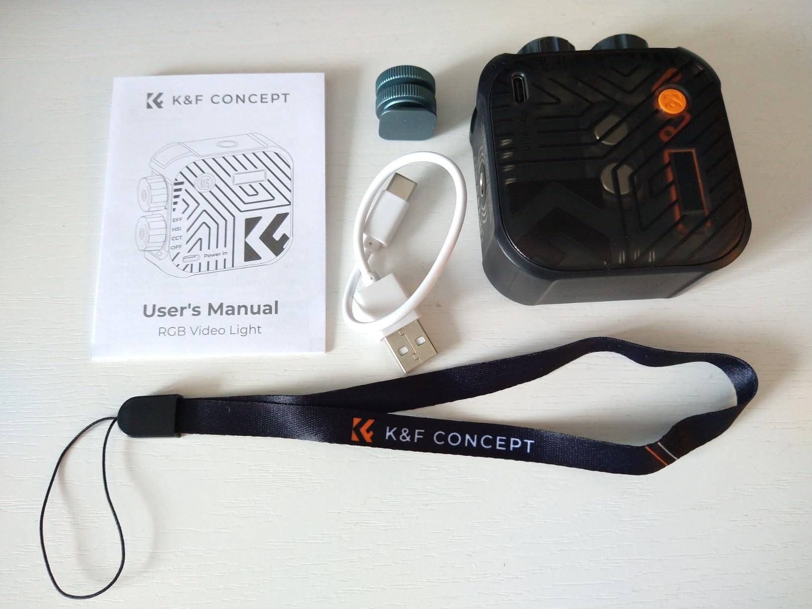 Tengo un montón de cosas de K&F y estoy muy feliz de agregar esta pequeña luz RGB a mi arsenal. Ya tengo algunas luces como esta, pero descubrí que las grandes perillas giratorias significan que llegarás al modo y brillo que deseas significativamente más rápido que con los pequeños botones que sueles encontrar. Estas luces pueden volverse MUY brillantes para su tamaño y se anuncian con un CRI de 96+, por lo que se puede confiar en la calidad de su color. Hay adaptadores de tornillo duales de 1/4, uno en cada extremo en caso de que las perillas estén cubiertas por otro accesorio. También está el soporte de zapata fría necesario. Obtienes un pequeño cable USB para cargar la luz y un pequeño cordón.